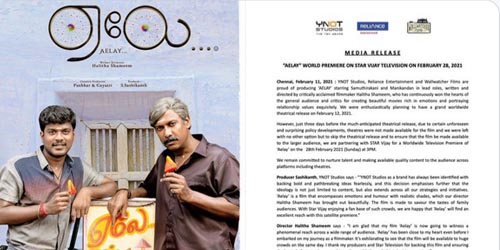 எனவே பிப்.,12 தேதி ரிலீசாக இருந்த ஏல்சே படம் வெளியாவது தாமதமாகும் என தகவல் வெளியான நிலையில், தற்போது,ஏலே படம் வரும் பிப்ரவரி மாதம் 28 ஆம் தேதி தொலைக்காட்சிகளில் நேரடியாக வெளியாகவுள்ளதாகத் தயாரிப்பு நிறுவனம் தனது டுவிட்டர் பக்கத்தில் ஒரு அறிக்கைவெளியிட்டுள்ளது.