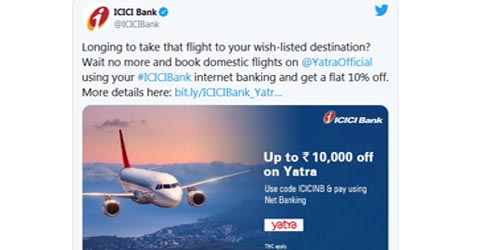 ஐசிஐசிஐ வங்கி தனது வாடிக்கையாளர்களுக்கு உள்நாட்டு விமானங்களில் 10% தள்ளுபடியை வழங்குகிறது. நிகர வங்கியைப் பயன்படுத்தி இந்த சலுகையைப் பயன்படுத்திக் கொள்ளலாம்.