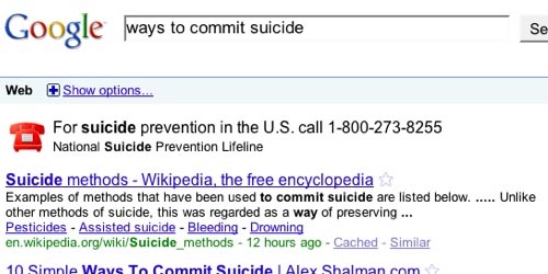 எந்த சந்தேகத்துக்கும் விடையளிக்கும், 'கூகுள்' தற்போது தற்கொலைக்கும் வழிகாட்டுகிறது; தற்கொலை நுட்பங்கள் குறித்த உள்ளடக்கத்தை வழங்கி ஆபத்தான வழியையும் காட்டுகிறது. பெரும்பாலும், தற்கொலை செய்துக்கொள்பவர்கள் அல்லது தற்கொலை செய்ய முயற்சிப்போர் உபயோகிக்கும் கருவிகளில் தற்கொலை செய்து கொள்வது எப்படி, உயிரை மாய்த்துக்கொள்வது எப்படி, வலியின்றி தற்கொலை செய்துகொள்வதெப்படி, தற்கொலை முறைகள் போன்ற, 'கூகுள்' தேடல்களைக் காணலாம்.